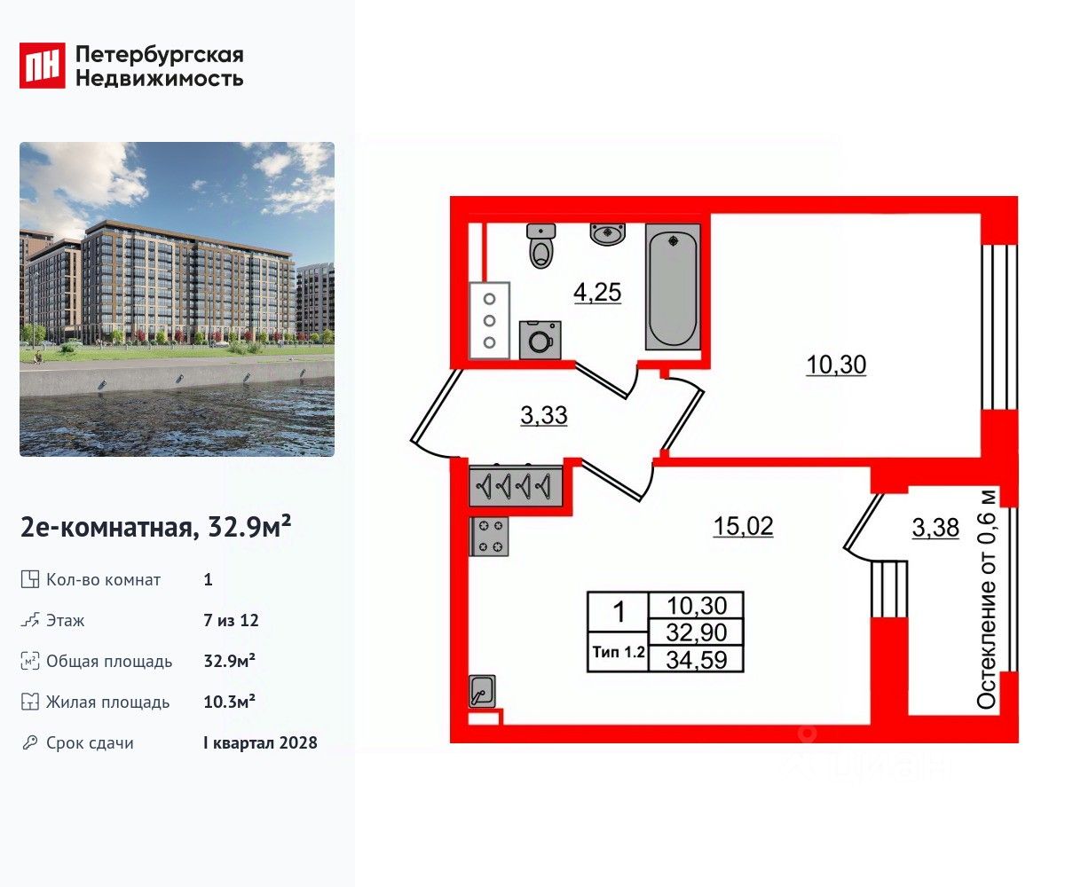 Удобная, классическая, функциональная европланировка, большая кухня-гостиная 15.02 м², вместительная прихожая 3.33 м². Общая площадь квартиры - 32.9 м², жилая 10.3 м², высота потолка 2.77 м.