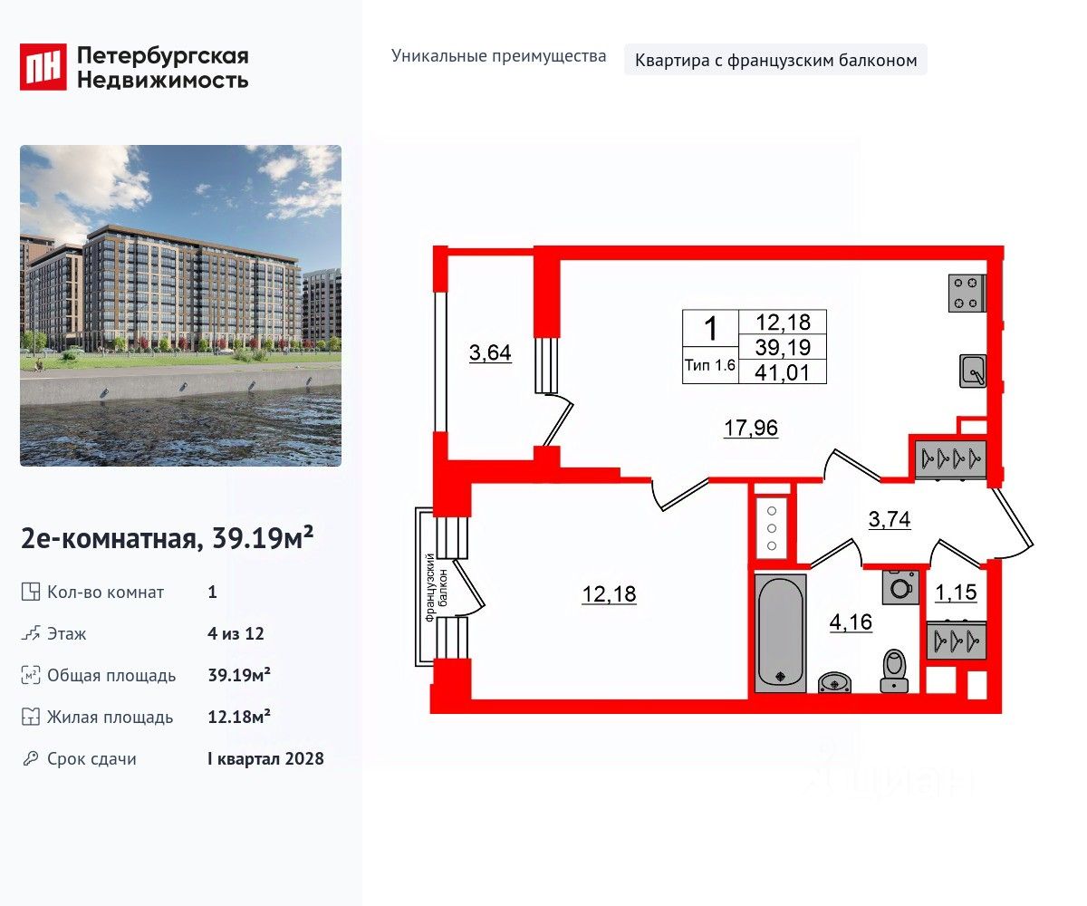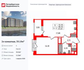 Уникальная, функциональная европланировка, большая кухня-гостиная 17.96 м², вместительная прихожая 3.74 м². Общая площадь квартиры - 39.19 м², жилая 12.18 м², высота потолка 2.77 м.