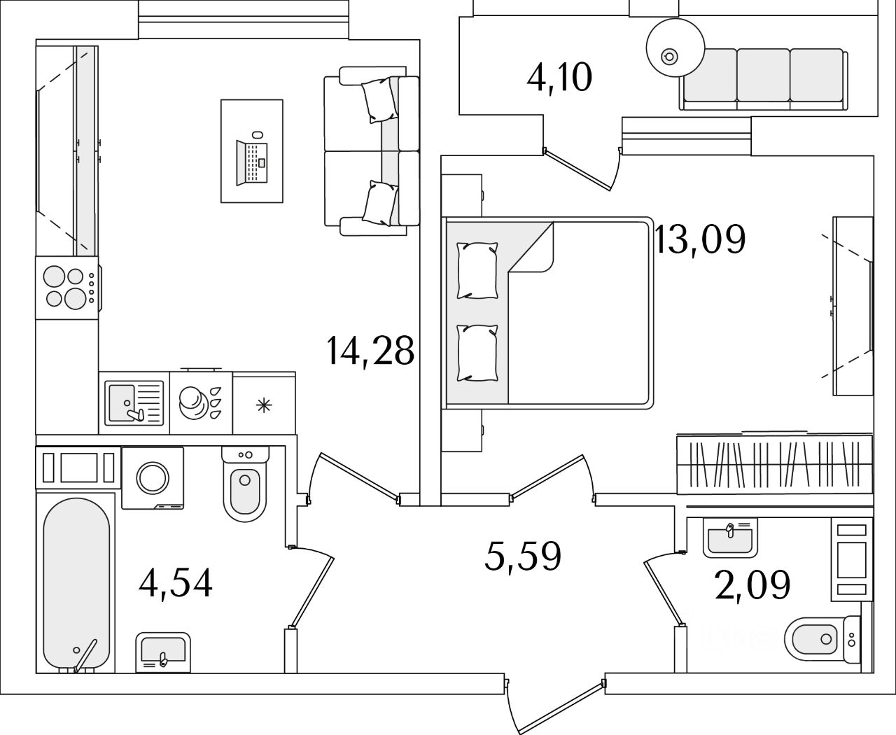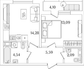 Квартира находится в 17 этажном доме, в ЛайнерЪ на 9 этаже. Общая площадь квартиры 41,30 кв.м.