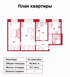 • Комнаты: 9,4 м² — 13,9 м² — 18,4 м²