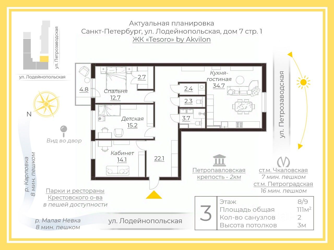 3. Идеальная планировка: 3 изолированные спальни (одна с гардеробной), кухня-гостиная 34,7 м с видом на Лахту, 2 санузла, постирочная.