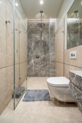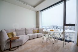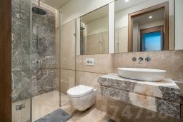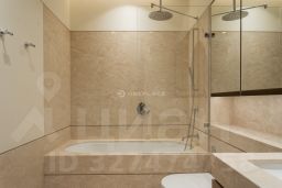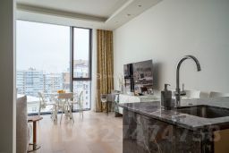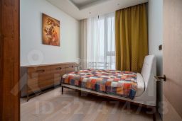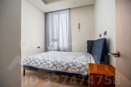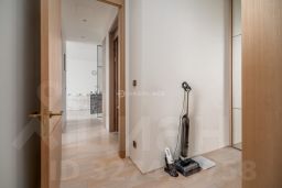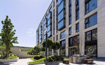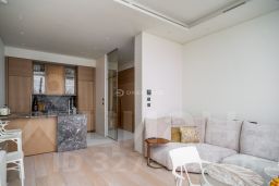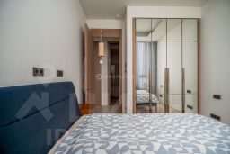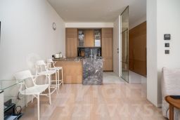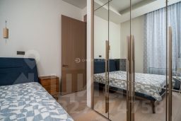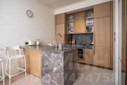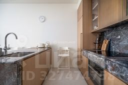 В отделке квартиры использованы натуральные материалы (шпон дерева, камень), установлена техника брендов Neff, Bosch. Два спальни, 2 отдельных санузла с ванной и душем и просторная кухня-гостиная с витринными окнами. Все оснащение квартиры включено в ее стоимость.