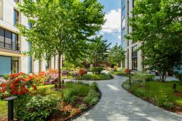 Закрытый двор с фонтаном и японским садом с плодовыми деревьями напоминает приватную территорию элитного отеля. Ландшафтный дизайн разработан британским ландшафтным бюро Gillespies.