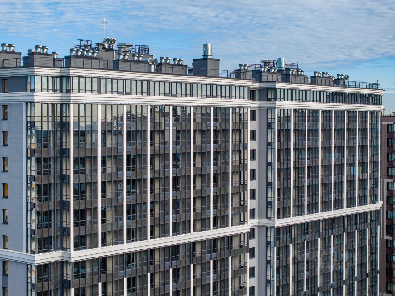 Фасады объекта окрашены в серые сдержанные тона и украшены вертикальными пилястрами, окрашенными в контрастный цвет и выступающими из плоскости стены; горизонтальными промежуточными и венчающим карнизом. Дополнительным украшением фасада служит использование панорамного остекления и облицовка первых двух этажей керамогранитом. Благодаря этому достигается целостный и гармоничный образ домов.
