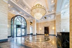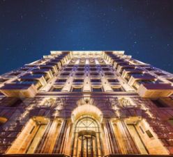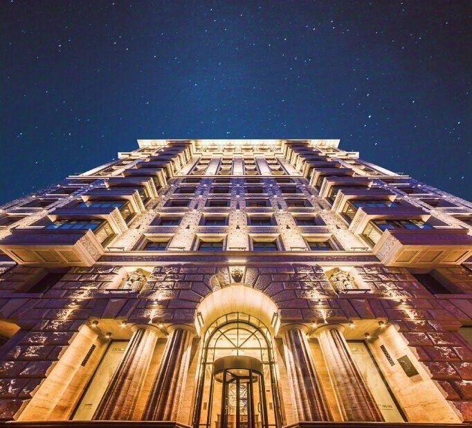 Помпезный холл с потолками 7 м. Фасад из юрского камня. Архитектурный проект выполнен мастерской Евгений Герасимов и партнеры. Каждый элемент дома наполнен смыслом и изысканными деталями — от фасада и вестибюля до каждого светильника и латунной дверной ручки. Парадный фасад Победы, 5 выходит на зеленый бульвар. Особое внимание уделено отделке просторного холла с потолком семиметровой высоты. Полы и стены выполнены в благородном природном камне, отдельного внимания заслуживают уникальные витражи холла и флорентийская напольная мозаика. Великолепие подчеркивает антикварная люстра, спасенная из ДК им. Первой пятилетки