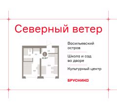 Однокомнатная квартира с предчистовой отделкой в ЖК "Северный ветер" на 6 этаже. Общая площадь: 33.89 кв.м., жилая: 8.8 кв.м., площадь просторной кухни-столовой: 12.6 кв.м. Все окна выходят на одну сторону. В квартире один совмещенный санузел. Высота потолков 2.98 м.