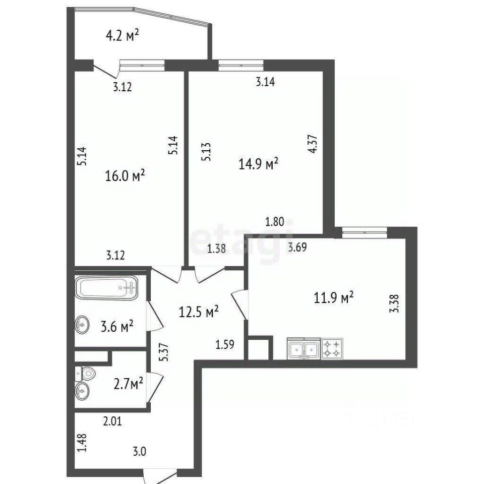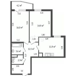 Две просторные комнаты площадью 14.9 м² и 16 м² позволяют расставить мебель на любой вкус.