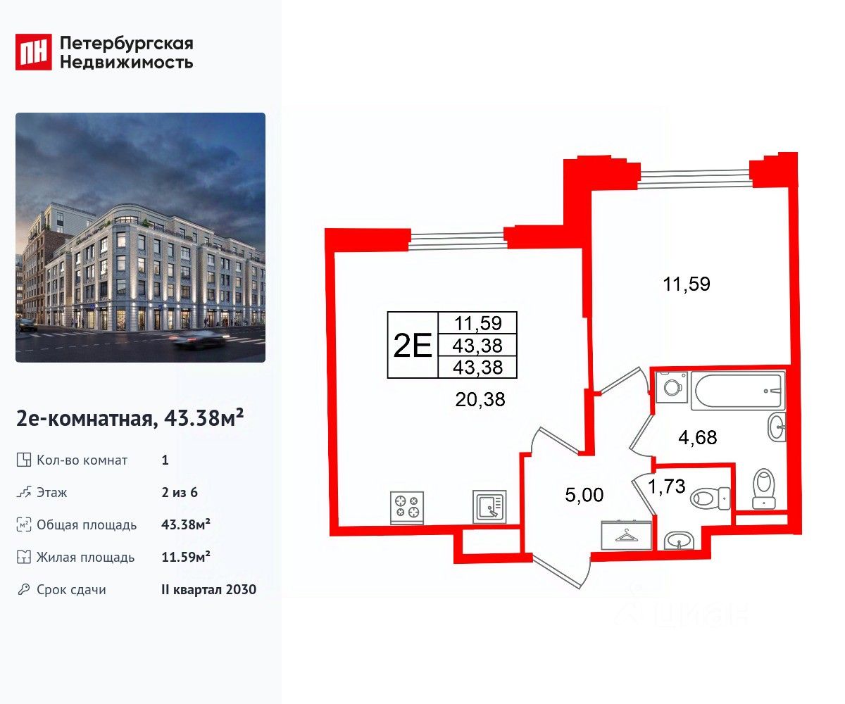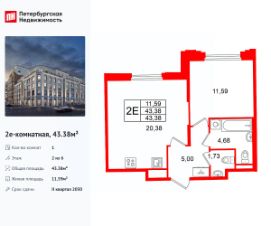 Удобная, классическая, функциональная европланировка, большая кухня-гостиная 20.38 м², просторная прихожая 5 м². Общая площадь квартиры - 43.38 м², жилая 11.59 м², высота потолка 3 м.