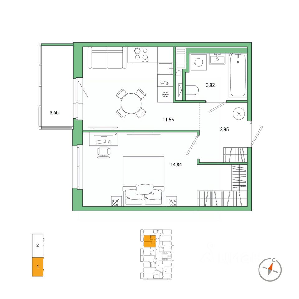 Жилая площадь14,8 м²