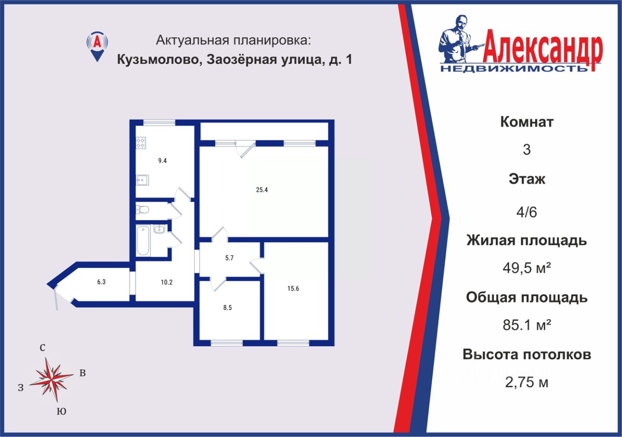 Представляем Вашему вниманию просторную трехкомнатную квартиру площадью 85,2 кв.м.: