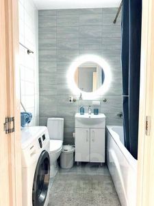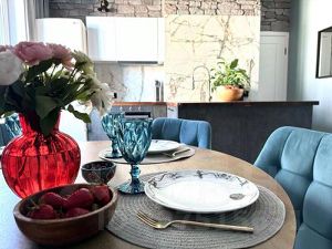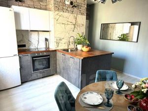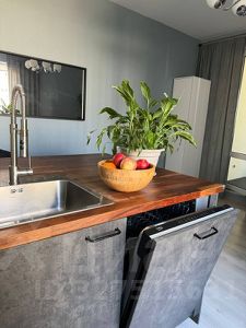 Кухонная мебель, бытовая техника (Холодильник Посудомоечная машина, Варочная поверхность, Духовой шкаф, Стиральная машина), а так же диван, стол и стулья.