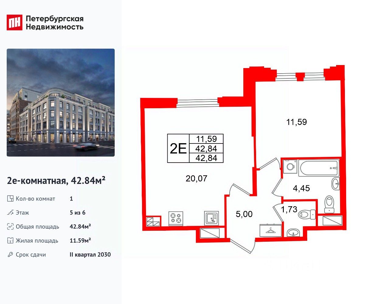 Удобная, классическая, функциональная европланировка, большая кухня-гостиная 20.07 м², просторная прихожая 5 м². Общая площадь квартиры - 42.84 м², жилая 11.59 м², высота потолка 3 м.