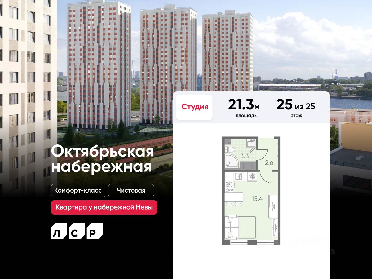 Продается студия в ЖК "Октябрьская набережная" на 25 этаже. Общая площадь составляет 21.30 кв. м. Квартира с чистовой отделкой . Жилой комплекс "Октябрьская набережная" располагается по адресу Санкт-Петербург, Невский.