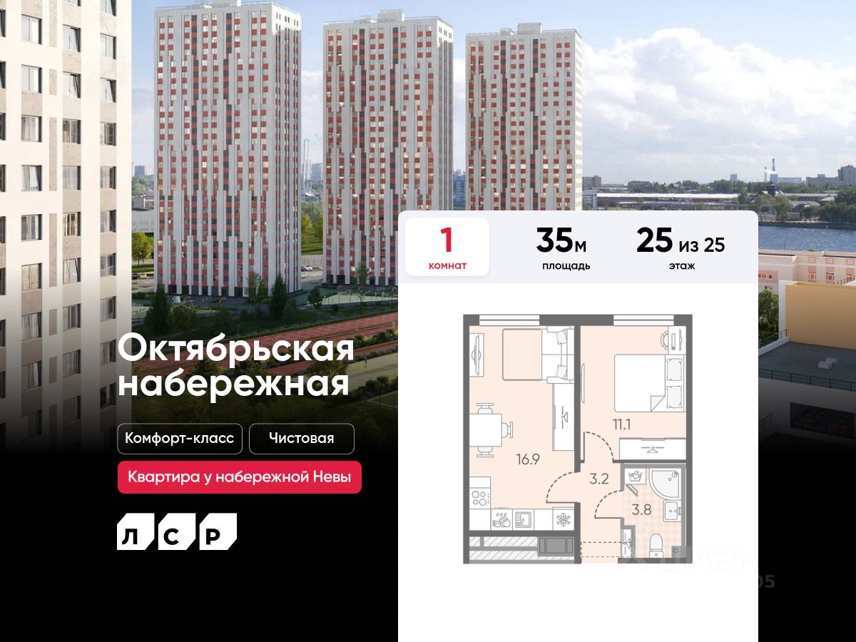 Продается 1-комнатная квартира в ЖК "Октябрьская набережная" на 25 этаже. Общая площадь составляет 35.00 кв. м. Квартира с чистовой отделкой . Жилой комплекс "Октябрьская набережная" располагается по адресу Санкт-Петербург, Невский.