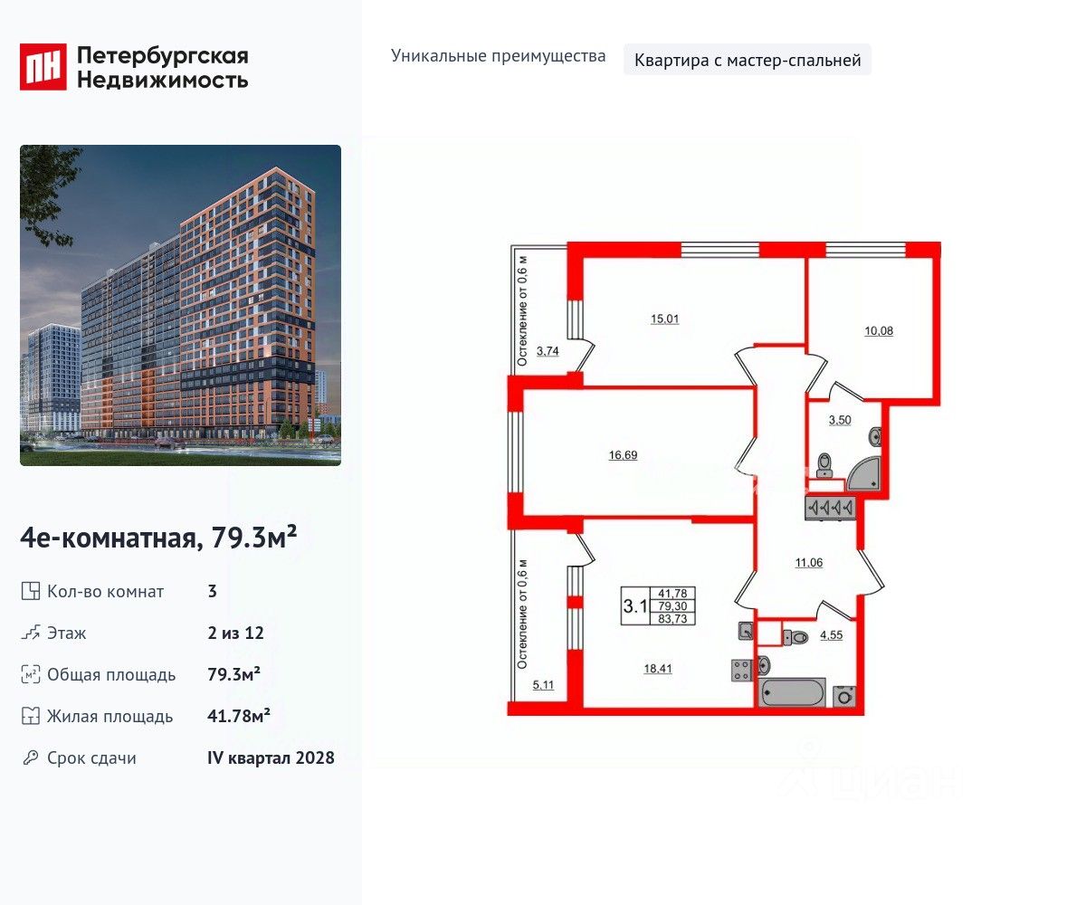 Уникальная, функциональная европланировка, большая кухня-гостиная 18.41 м², вместительная прихожая 11.06 м². Общая площадь квартиры - 79.3 м², жилая 41.78 м², высота потолка 2.77 м.
