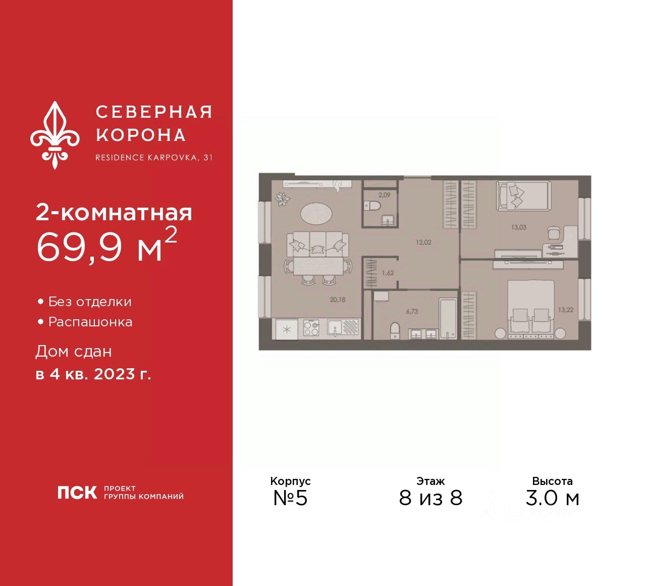Просторная 2-комн. квартира в ЖК "Северная корона" на 8 этаже. Квартира без отделки, после оформления собственности можно делать ремонт. Общая площадь: 69.9 кв.м., жилая: 26.25 кв.м., площадь просторной кухни-столовой: 20.18 кв.м. Квартира - распашонка, без проходных комнат, окна выходят на paзные стороны дома. В квартире один совмещенный и один раздельный санузел. Высота потолков 3.0 м.