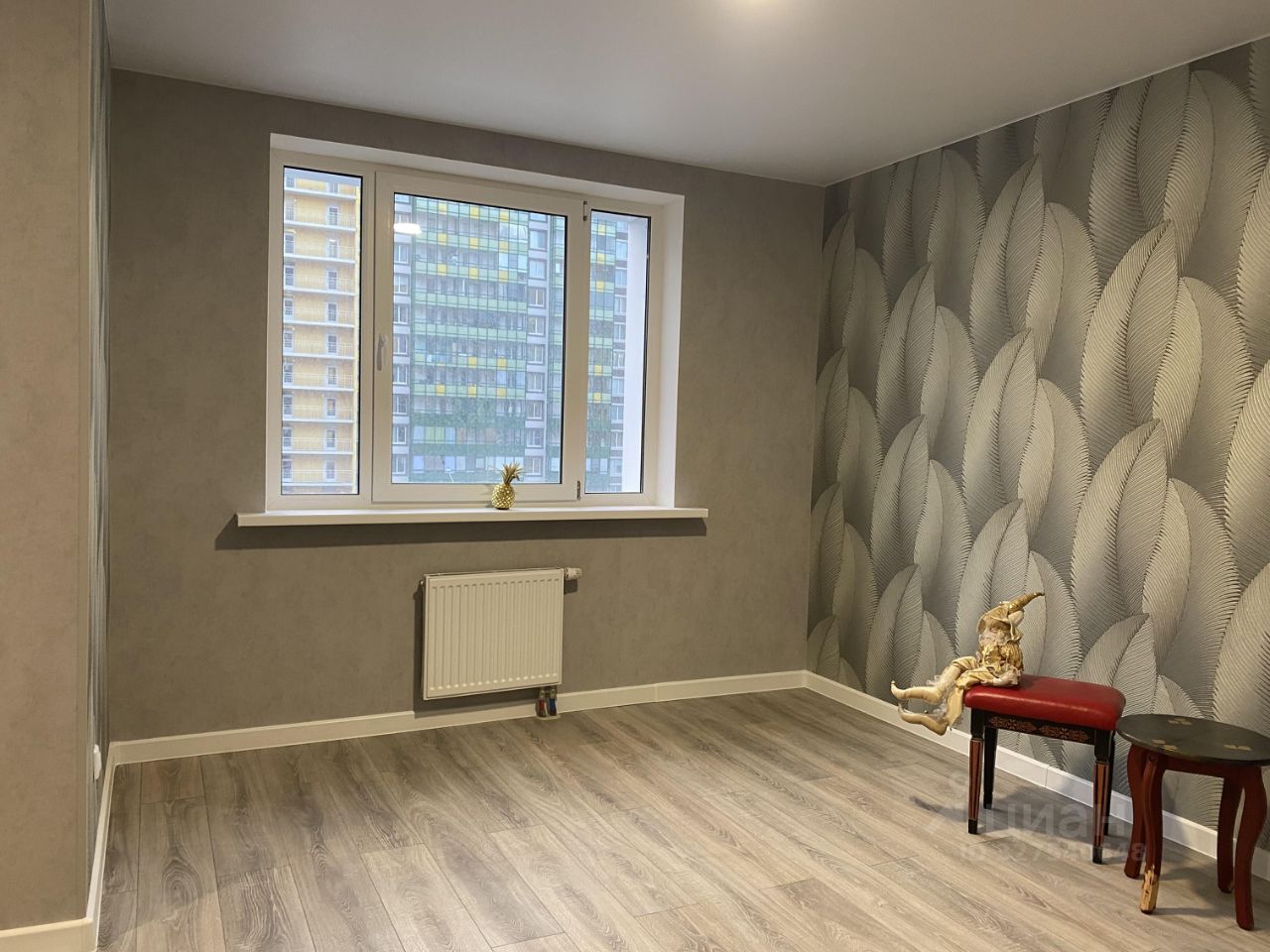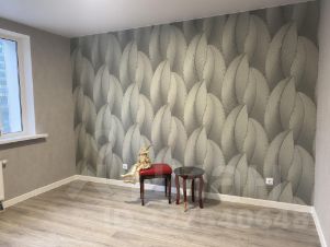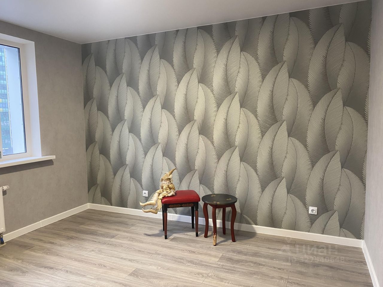 В комнате обои с позолоченным растительным орнаментом, выделены две акцентные стены. качественный натяжной потолок (без запаха). Ламинат 33 класс в комнате и прихожей.