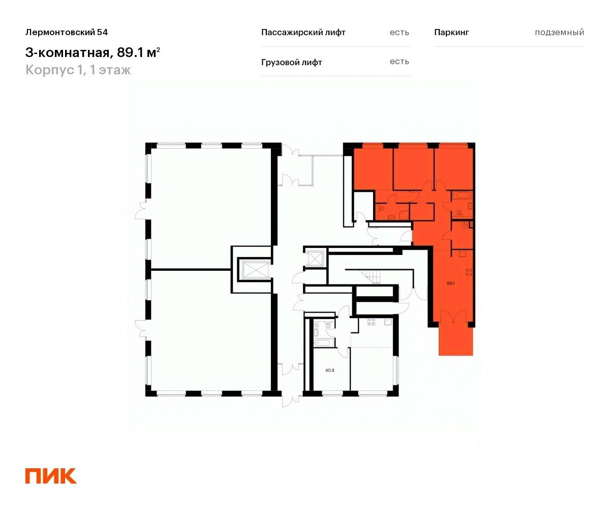 Продаётся 3-комн. квартира площадью 88 кв.м на 1 этаже 7 этажного дома (Корпус 1, Секция 1) проекта ПИК Лермонтовский 54. Светлый просторный подъезд на уровне земли, функциональная планировка, большие окна, предчистовая отделка.