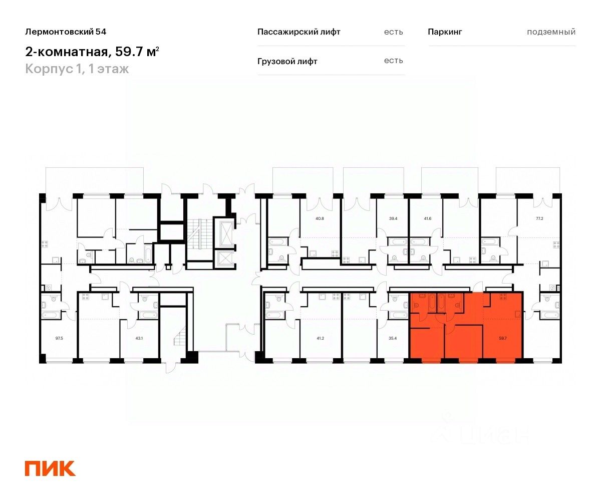 Продаётся 2-комн. квартира площадью 59,1 кв.м на 1 этаже 9 этажного дома (Корпус 1, Секция 2) проекта ПИК Лермонтовский 54. Светлый просторный подъезд на уровне земли, функциональная планировка, большие окна, предчистовая отделка.