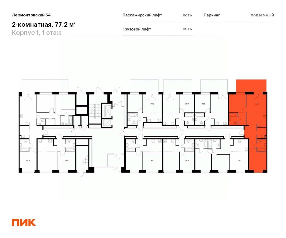 Продаётся 2-комн. квартира площадью 76,1 кв.м на 1 этаже 9 этажного дома (Корпус 1, Секция 2) проекта ПИК Лермонтовский 54. Светлый просторный подъезд на уровне земли, функциональная планировка, большие окна, предчистовая отделка.