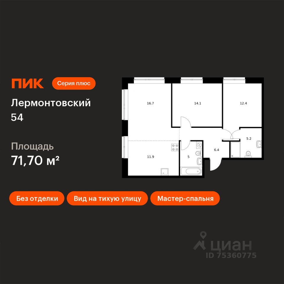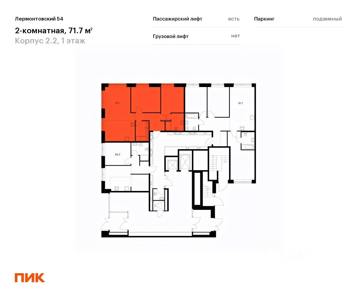 Продаётся 2-комн. квартира площадью 71,8 кв.м на 1 этаже 9 этажного дома (Корпус 2.2, Секция 10) проекта ПИК Лермонтовский 54. Светлый просторный подъезд на уровне земли, функциональная планировка, большие окна, без отделки.