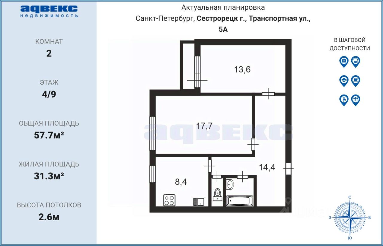 В квартире огромная прихожая с удобной нишей для обустройства гардеробной, хорошая светлая кухня, две очень приличные по площади комнаты и аккуратная лоджия. Все окна выходят на запад, и поэтому есть возможность любоваться шикарными закатами. А ещё из окон виден залив и даже Морской Никольский Собор в Кронштадте!