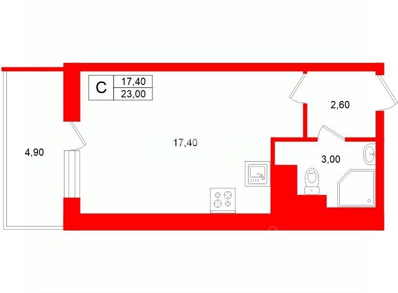 • В ванной комнате (3 м2) уже установлена душевая кабина и стиральная машина.