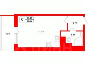 Главная особенность комнаты (17.4 м2) — два окна. Это делает квартиру очень светлой и позволяет грамотно зонировать пространство на уютную спальню и функциональную кухонную зону.