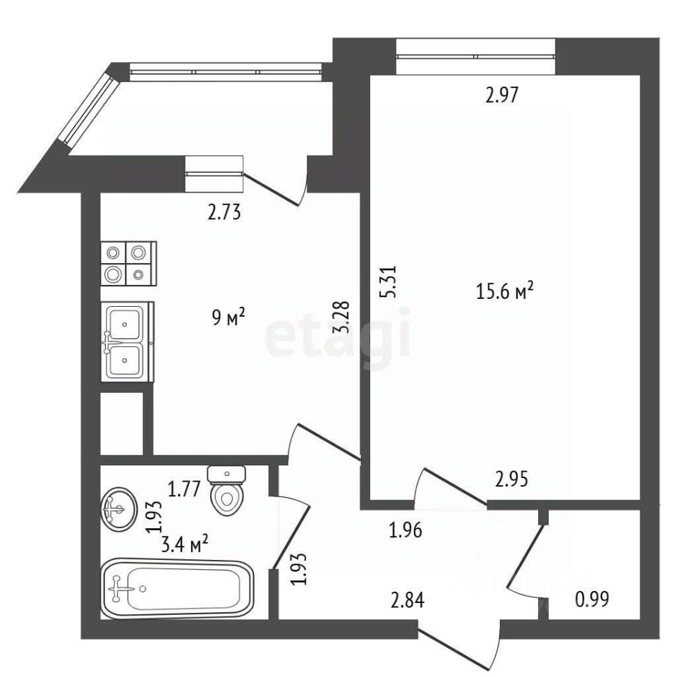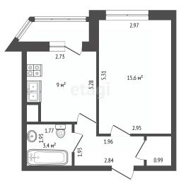Планировка отличается практичностью: просторная комната 15,6 м², функциональный коридор со встроенным шкафом-купе для хранения и изолированная кухня площадью 9 м² с выходом на балкон.