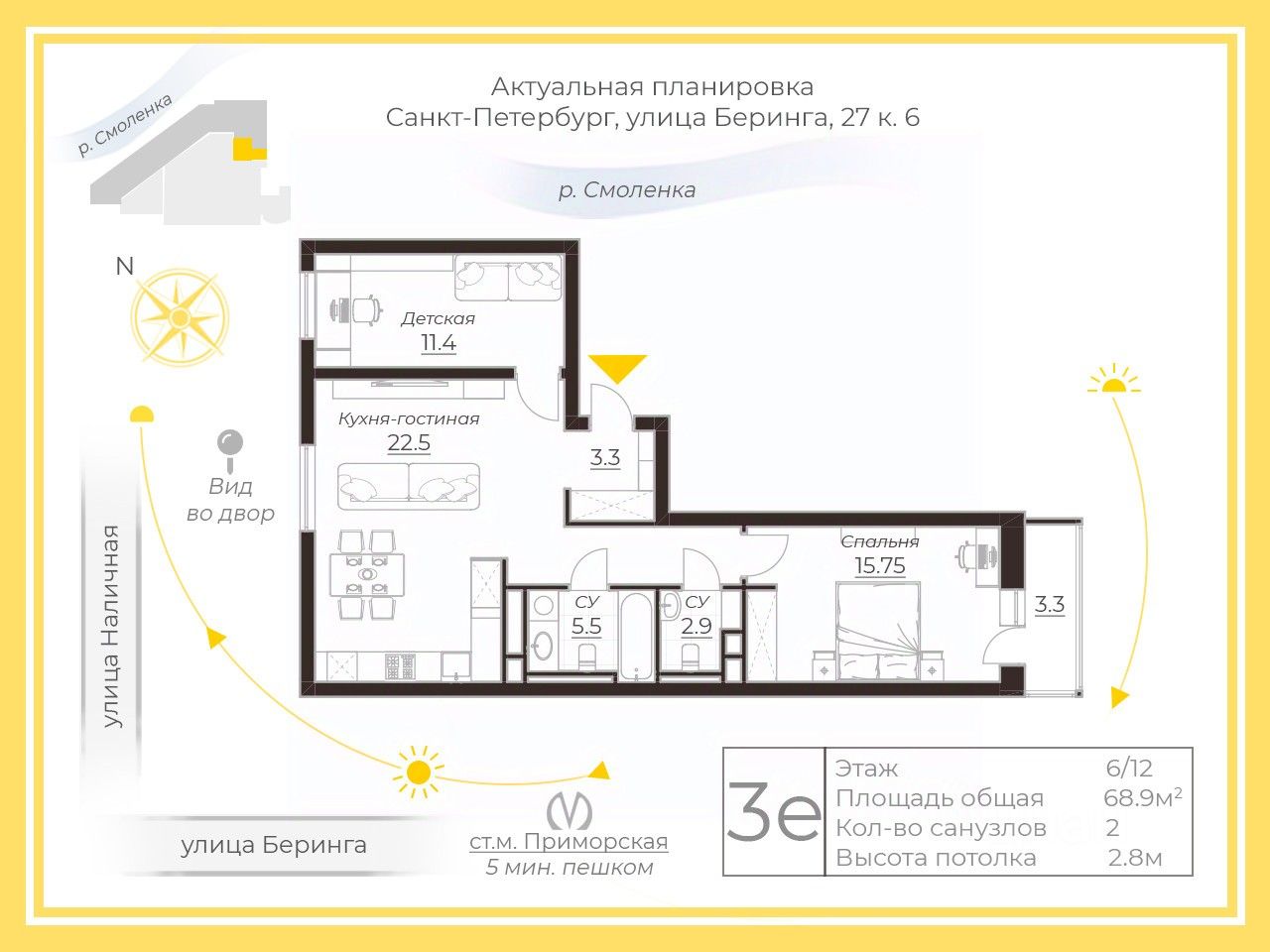 • Всего 5 минут до метро Приморская