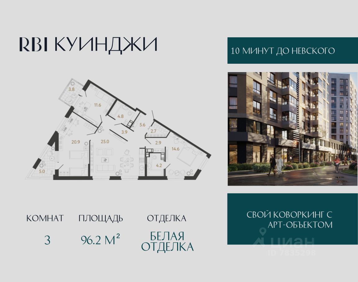 "Куинджи". Дом высокого класса от RBI на Лиговском проспекте в историческом центре Петербурга. Дом строится в перспективном районе на Лиговском проспекте в пешей доступности от метро "Обводный канал". "Куинджи" — проект, который завершает строительство в этой уникальной локации: будущие жители заедут в благоустроенный жилой кластер. Отсюда удобно добраться до любой точки города — аэропорта "Пулково", Московского вокзала и достопримечательностей исторического центра. Рядом ТРЦ "Лиговъ" с популярными магазинами и кафе, кинотеатром, разнообразными досуговыми возможностями. магазинами одежды и ресторанами. Легко добраться до главного городского ТРЦ "Галерея", модных фудкортов Vokzal 1853 и "Московского рынка". Дизайн-код проекта вдохновлён творчеством русского художника Архипа Куинджи и отражает идеи бесконечности света и безмятежности времени в каждой детали. Приватный двор-парк пересекает бликующий на солнце ручей. Рядом — уютная беседка с качелями и "зелёная комната" для наблюдения за облаками. Детская площадка зонирована для малышей и подростков, каждая из них выполнена из натуральных материалов в оттенках полотен Куинджи. Двухуровневое лобби украшает световой арт-объект от резидента "Эрарты". В седьмом корпусе дома расположится детский сад. "Куинджи" — дом, озарённый светом. В 10 минутах от Невского.