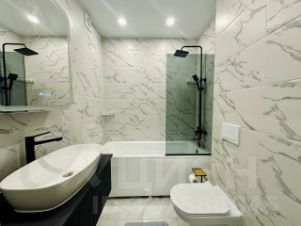 Санузел совмещен, отделан кафелем, установлен унитаз с инсталляцией, а полноценная ванная позволит расслабится после рабочего дня.