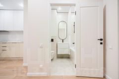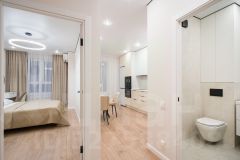 - Санузел, размером 3.7 квадратных метра. На полу выложен широкоформатным керамогранитом, на стенах качественной керамической плиткой. Установлена акриловая ванная длиной 170 сантиметров, оборудованная шторой с потолочным карнизом, имеется электрический полотенцесушитель, инсталяция, подвесная тумба с раковиной и зеркало с подстветкой. В санузле установлен теплый пол с терморегулятором.