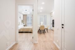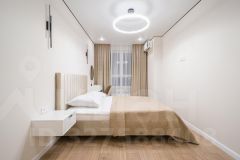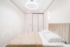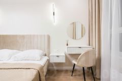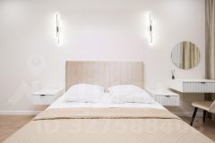 - Большая спальня 15.3 квадратных метров из которых 1.5 квадратных метра вместительная гардеробная. Спальня оборудована двуспальной кроватью шириной 160 сантиметров с ортопедическим матрасом и подъемным механизмом, туалетным столиком с зеркалом и стулом, прикроватными тумбами и СПЛИТ-СИСТЕМОЙ, что немаловажно в последнее время в Санкт-Петербурге.