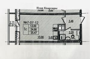 Общая площадь квартиры составляет 24.6 кв. м, из которых 14 кв. м жилая зона, а кухня занимает 5 кв. м. Квартира находится на 7-м этаже 12-этажного дома, построенного в 2020 году из монолитно-кирпичных материалов. Высота потолков 2.58 метра, что создает ощущение простора.
