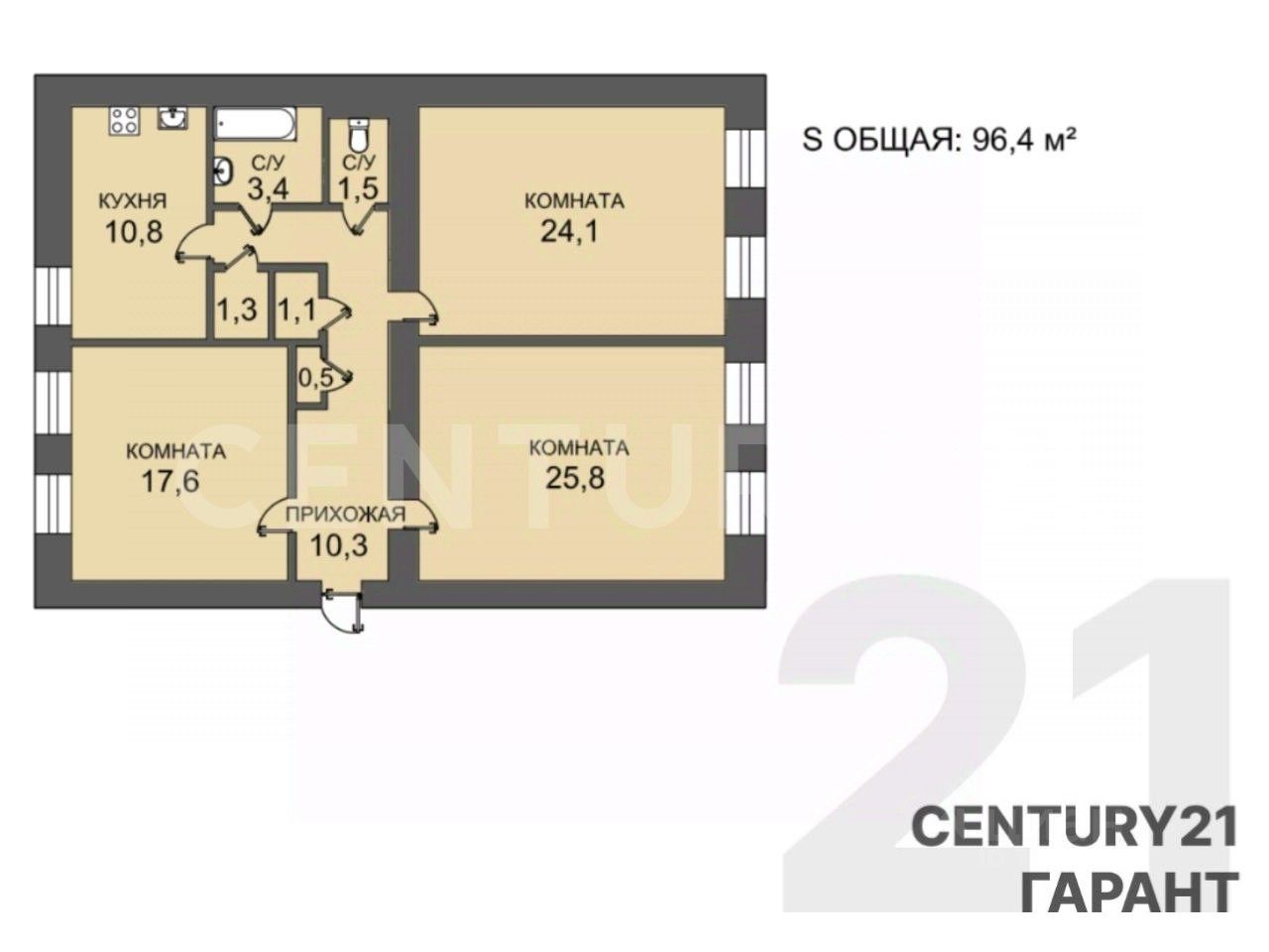 Общая площадь — 96,4 м², из них 25,8 м², 24,1 м² и 17,6 м² — размеры комнат, а кухня — 10,8 м².