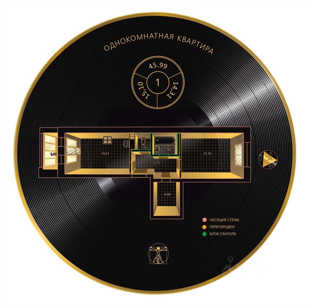 - Общая площадь 45,99 м2.