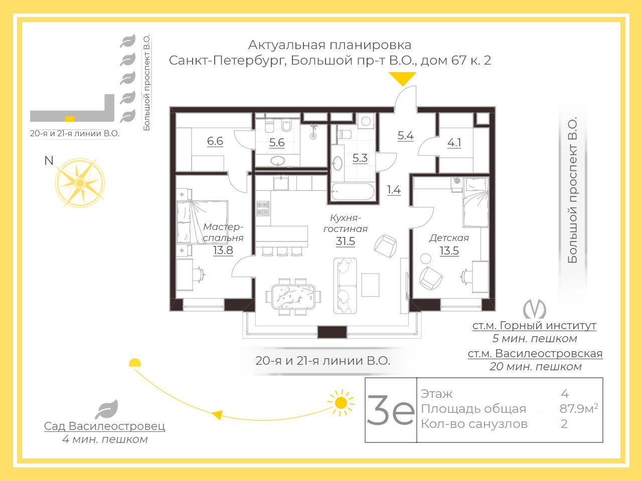 Большая кухня-гостиная 31,50 м кв, мастер-спальня с гардеробной и ванной комнатой, вторая комната под детскую или кабинет, гостевой санузел и большая гардеробная в прихожей.