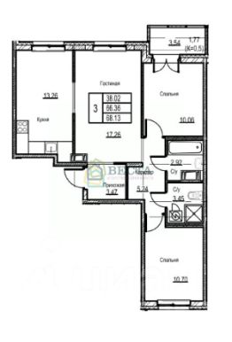 Просторная трехкомнатная квартира с лоджией и площадью 65.5 квадратных метра, располагающаяся на 3 этаже двенадцатиэтажного дома.