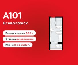 Видовая студия площадью 20.80 в ЖК "А101 Всеволожск" c лоджией на 8 этаже. Квартира с отделкой. Вид из окна во двор. В квартире 1 санузел. Высота потолков 2.95 м.