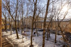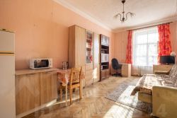 В большой комнате (27.6 кв м) сделан ремонт и грамотное зонирование: выделена зона под кухню (нет воды) и большая комната с двумя окнами как спальня-гостиная. Есть необходимая мебель для проживания: холодильник, шкафы, кровать, стол. Вид из окон в большой открытый двор. Окна - СТП. Новые радиаторы. И есть отдельный предбанник, где можно расположить небольшую гардеробную и зону коридора.