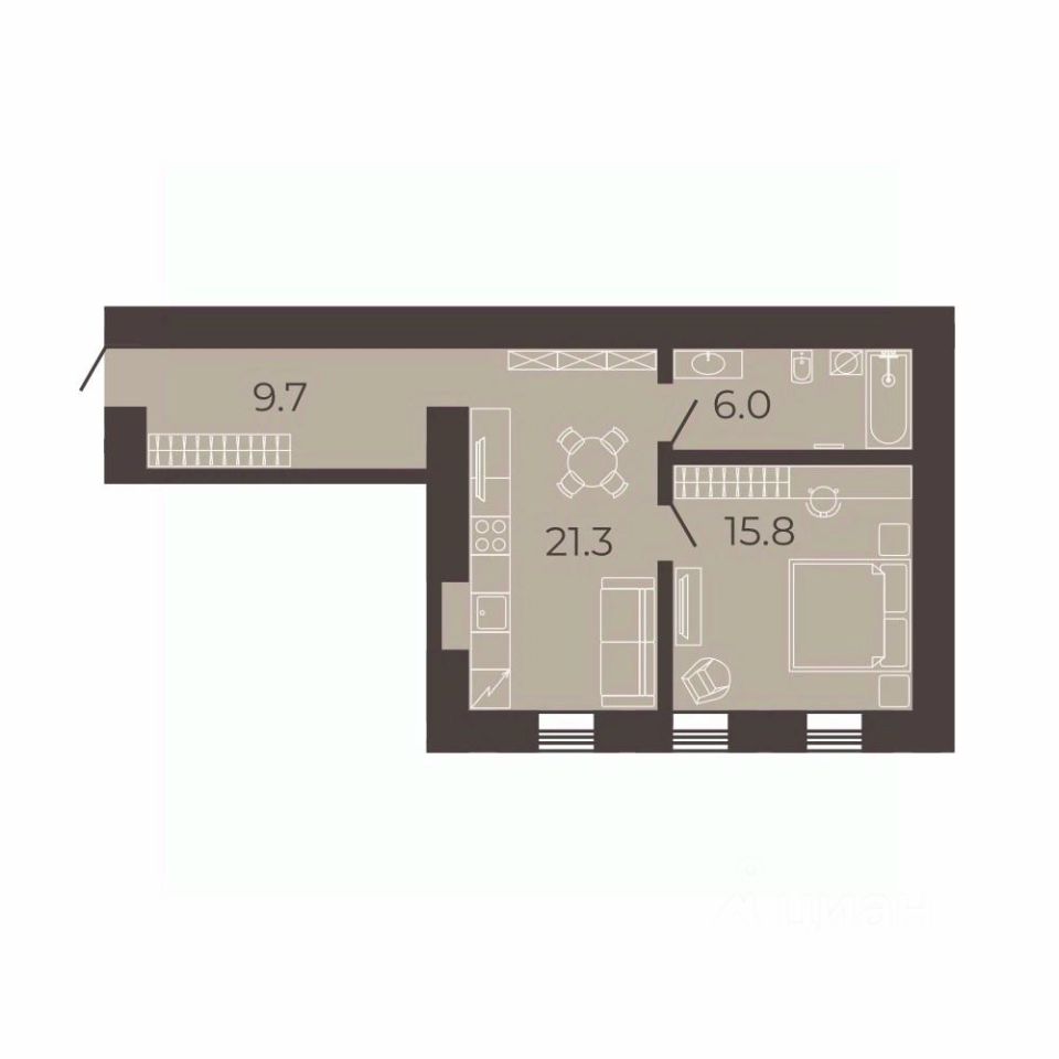 Евро-двухкомнатная квартира 52.8 м2 с кухней 21.3 м2 и просторным санузлом 6 м2;