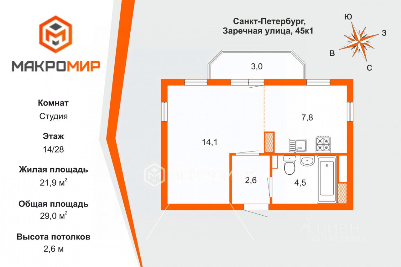 Планировка удобная: основное пространство 21,9 м², которое легко зонировать на кухню, зону отдыха и спальное место.