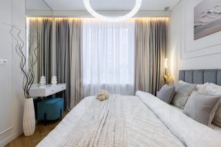 Спальня с встроенным шкафом и консольным столом с зеркалом.