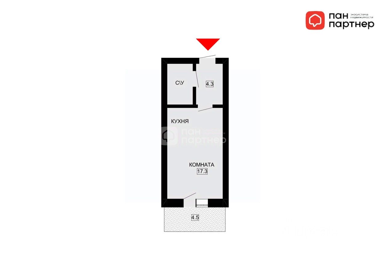Общая площадь 25.4 м2 (по документам, по факту с лоджией 29,9м2), комната 17.3 м2, прихожая 4.3 м2, с/у 3,8 м2, лоджия 4.5 м2.