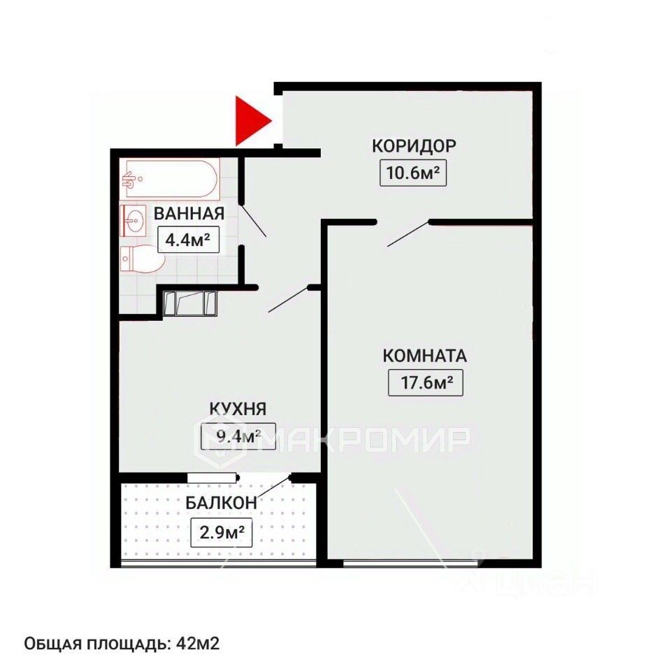 Площадь квартиры: 42,5 м² (без учёта лоджии). Застеклённая лоджия: 2,9 м².