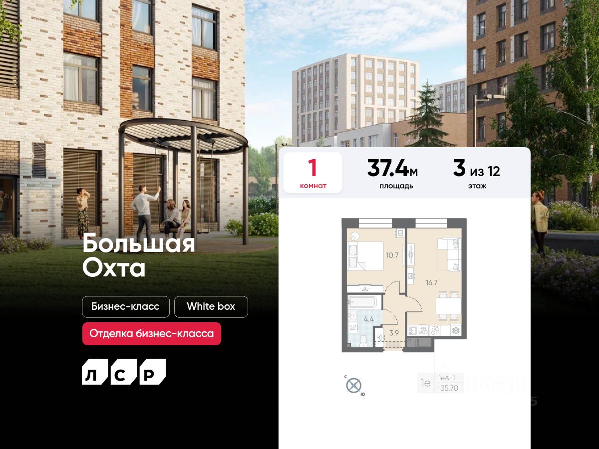 Продаётся 1-комнатная квартира в ЖК "Большая Охта" на 3 этаже. Общая площадь составляет 37.40 кв. м. Квартира с white box отделкой. Жилой комплекс "Большая Охта" располагается по адресу Санкт-Петербург, Красногвардейский.
