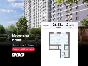 Продается студия в ЖК "Морская миля" на 2 этаже. Общая площадь составляет 26.53 кв. м. Квартира с чистовой отделкой. Жилой комплекс "Морская миля" располагается по адресу Санкт-Петербург, Красносельский.