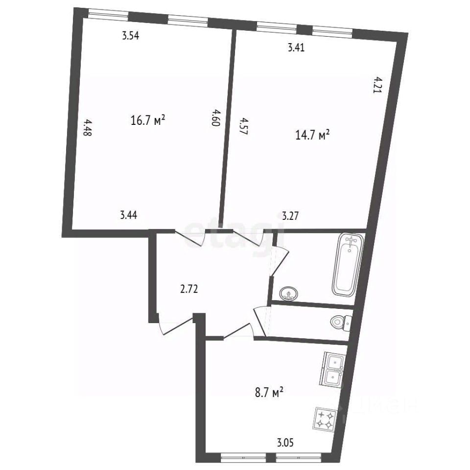 Планировка отличается рациональностью: все помещения, включая кухню площадью 8,7 кв.м, имеют квадратную форму, что облегчает расстановку мебели.