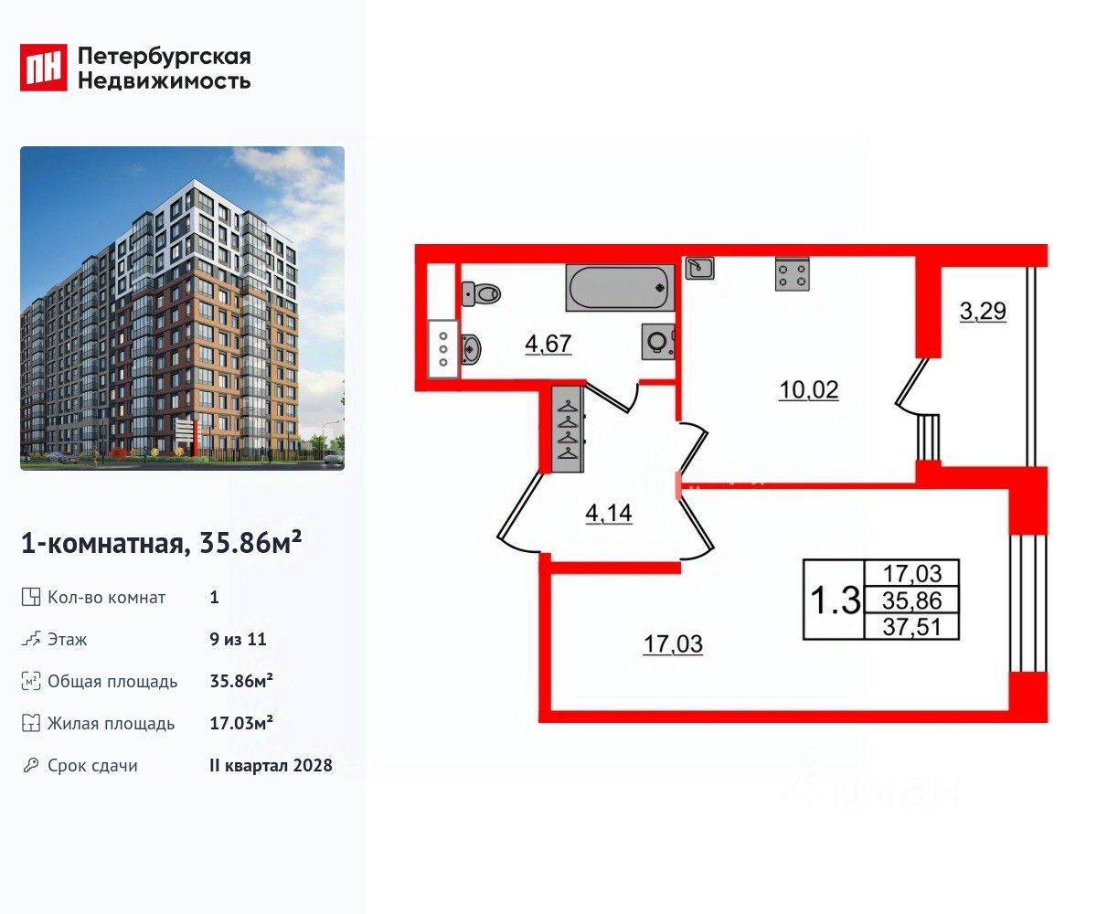 Удобная, классическая планировка, кухня 10.02 м², вместительная прихожая 4.14 м². Общая площадь квартиры - 35.86 м², жилая 17.03 м², высота потолка 2.77 м.